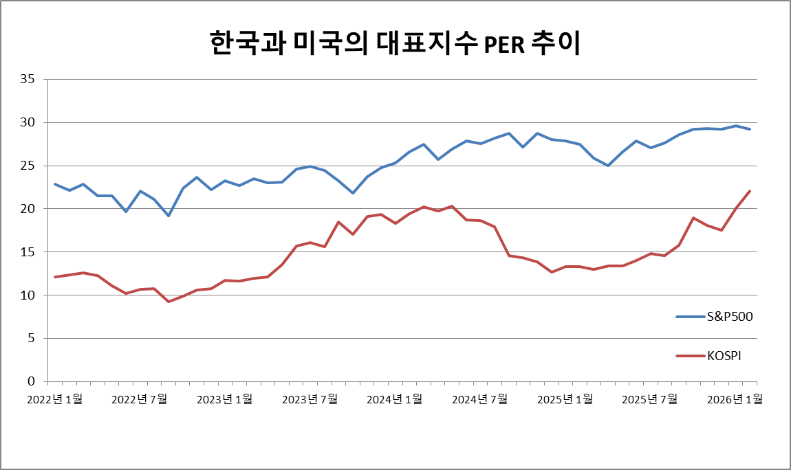 "KOSPI는 S&P500 대비 PER이 낮다."